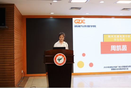 周凯茵同学作为梅州直播电商小队代表发言:“我们不仅体验了,实践了,更是收获了,成长了。”为了让更多的人尝试并爱上优质农产品,梅州直播电商小队的老师和学生白天参观,晚上写稿,使出浑身解数,希望能呈现出最好的效果。于发言的最后,周凯茵同学对学院提供的宝贵机会以及促成这次活动的老师和同学们表示了感谢。