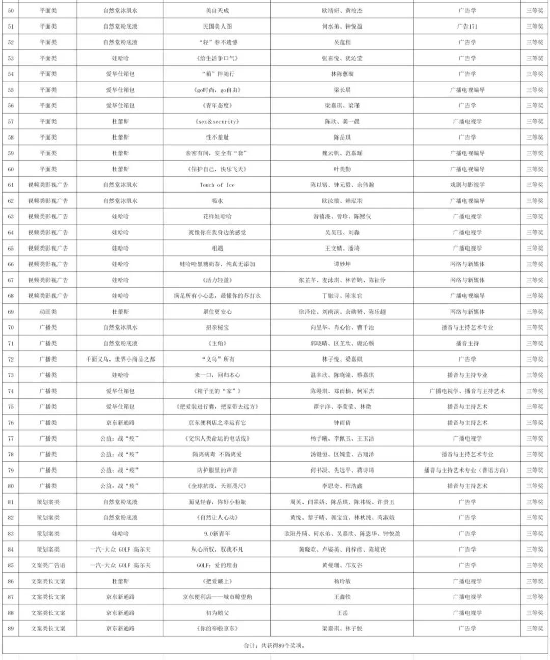 获得省级奖项89项,其中国奖20项,佳绩可喜可贺喜人。这不仅得益于同学和老师们付出的努力,也得益于“互联网+”和“大广赛"等优质创新创意平台给予的引导和激励。