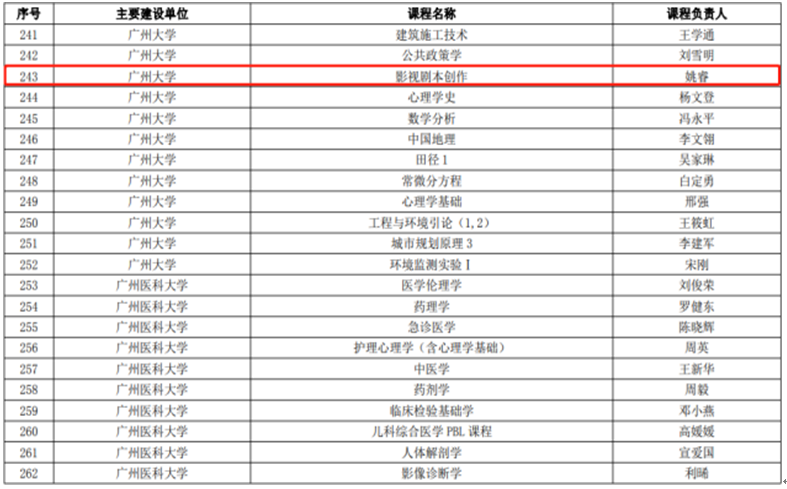 姚睿老师负责的《影视剧本创作》课程被认定为2020年度广东省一流本科课程。