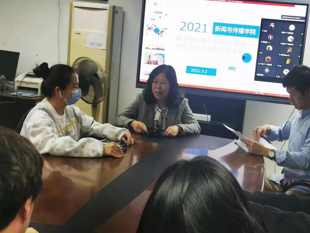 在文逸楼609会议室以线下线上相结合的方式召开了春季返校第一课暨2021届毕业生就业主题教育年级会,学院党委书记李雁、副书记方建平以及17级年级辅导员高莹莹对全体2021届毕业生全体班干部同学进行了返校防疫工作布置以及毕业生就业教育指导。