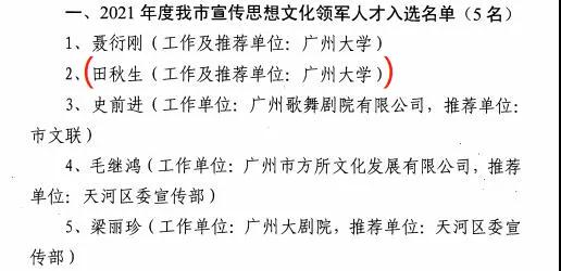 院长田秋生教授入选广州市宣传思想文化领军人才名单。