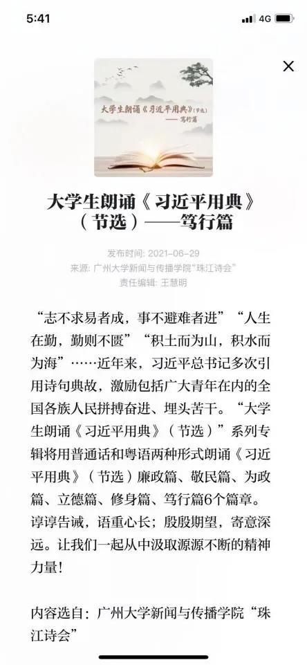 学科优势,立足广州,服务粤港澳大湾区文化建设,是创作、朗诵及展示中华优秀文化风采的平台。”珠江诗会“微信公众号推送内容以诗词类作品朗诵为主,截止目前,已制作150期内容,推出了《廉政百篇》50期和《习近平用典》100期。