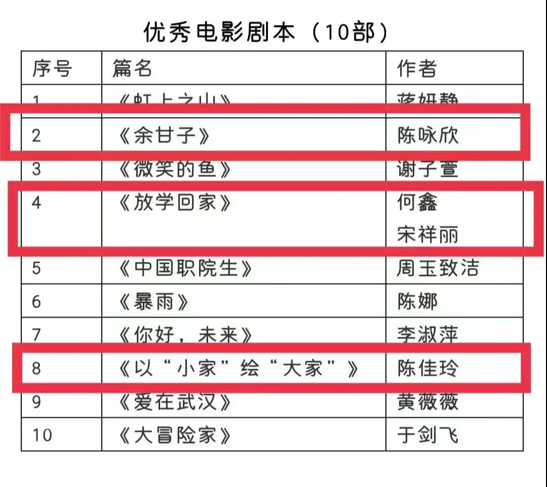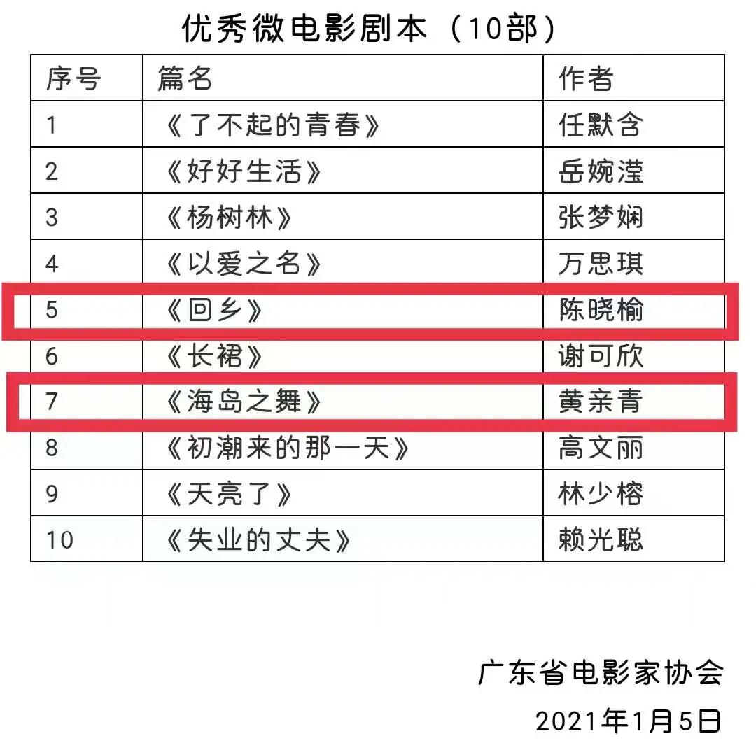 20级研究生陈咏欣同学的作品《余甘子》入围优秀电影剧本;21级本科生何鑫同学的作品《放学回家》入围优秀电影剧本;20级研究生陈佳玲同学的作品《以“小家”绘“大家”》入围优秀电影剧本;20级研究生陈晓榆同学的作品《回乡》入围优秀微电影剧本;20级研究生黄亲青同学的作品《海岛之舞》入围优秀微电影剧本。