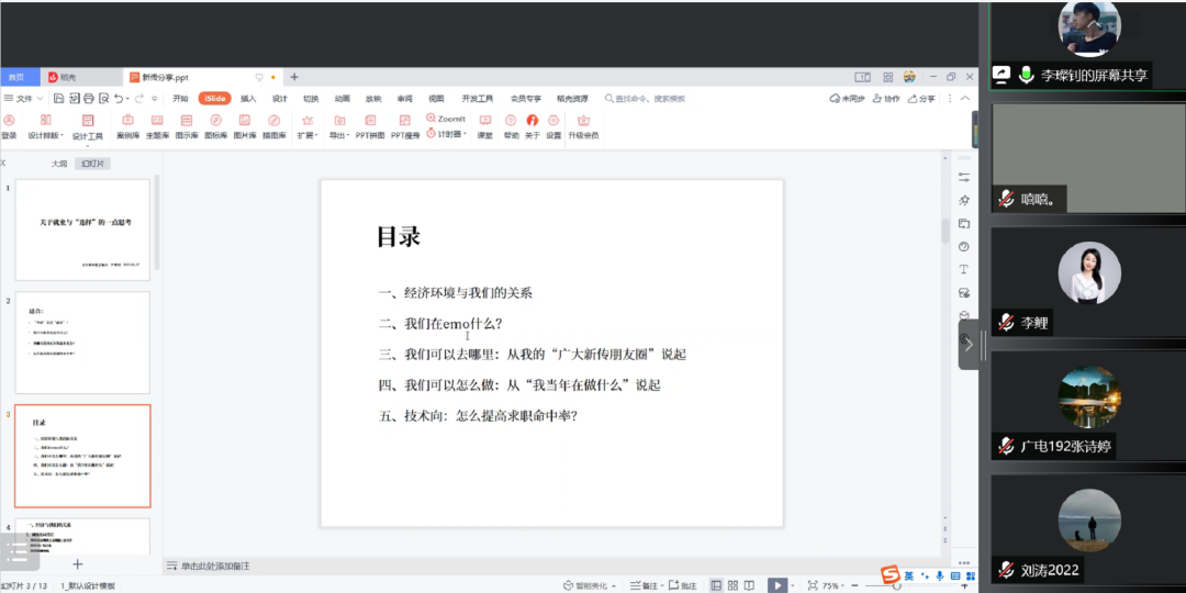 李璨钊师兄现身说法,主要从五个方面介绍了择业心得,分享了就业建议。包括经济环境与我们的关系、我们在emo什么、我们可以去哪里、我们可以怎么做、怎么提高求职命中率等毕业生们关切的话题,既有心路历程、典型案例,又有宏观思考、细致建议。