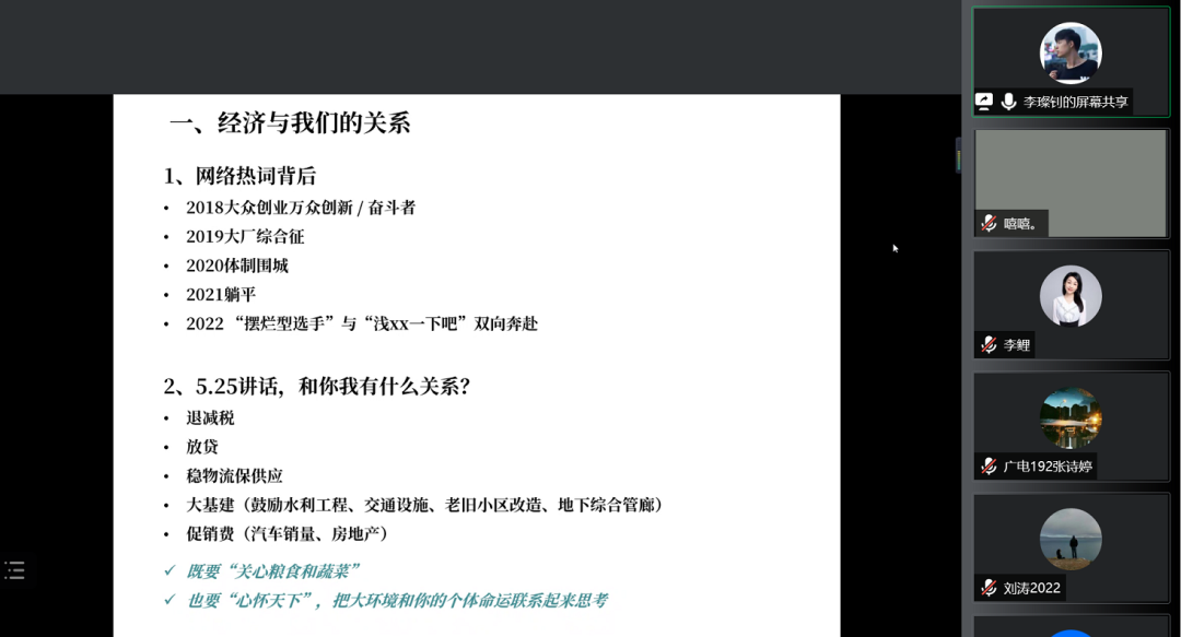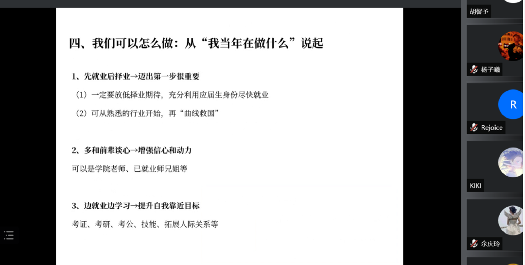 在前两个方面,首先结合疫情下的经济环境,建议同学们既要“关心粮食和蔬菜”也要“心怀天下”,把大环境和你的个体命运联系起来思考。紧接着,分析了几点毕业生会面临的焦虑情绪,并结合亲身经历嘱咐同学们无需过度焦虑。