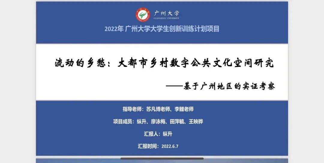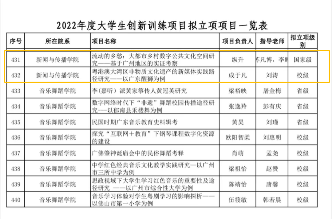 有两个项目荣获推荐立项。其中,《流动的乡愁:大都市乡村数字公共文化空间研究——基于广州地区的实证考察》获国家级立项,该项目负责人为纵升,指导老师为苏凡博、李鲤;《粤港澳大湾区非物质文化遗产的新媒体实践路径研究——以广东醒狮为例》荣获校级立项,该项目负责人为成于凡,指导老师为刘涛。