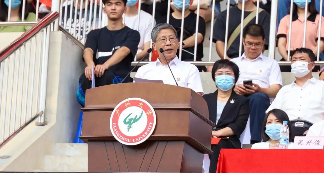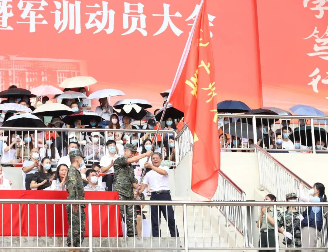 教师代表及新生代表发言后,校党委书记、校长魏明海向2022年新生军训承训单位——中国人民武装警察部队广州支队授予军训团团旗。一声令下,2022级新生军事训练正式开始。