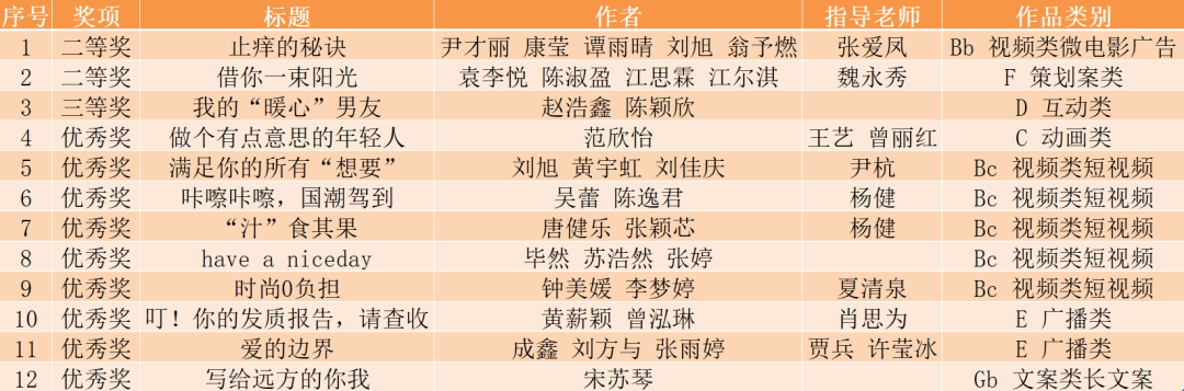 学生荣获国奖13项(全校15项),其中二等奖2项,三等奖1项,优秀奖10项。张爱凤、魏永秀、夏清泉、王艺、曾丽红、尹杭、杨健、肖思为、许莹冰等老师指导的作品在大广赛国赛中获奖。具体获奖名单如下: