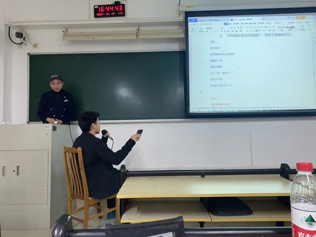 讲座中,同学们踊跃举手,积极参与。在马瑞老师的指导下,几位同学分别用粤语、普通话给不同类型的纪录片配音,配合理解文字稿件,找实声气口儿,跟随纪录片原声配音等展开课堂练习。