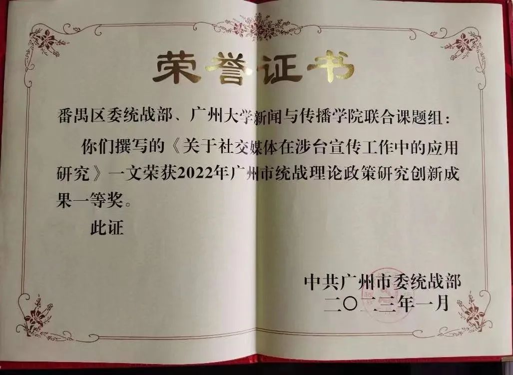 曾丽红教授团队撰写的调研报告《关于社交媒体在涉台宣传工作中的应用研究》一文荣获2022年广州市统战理论政策研究创新成果一等奖。做爱自拍