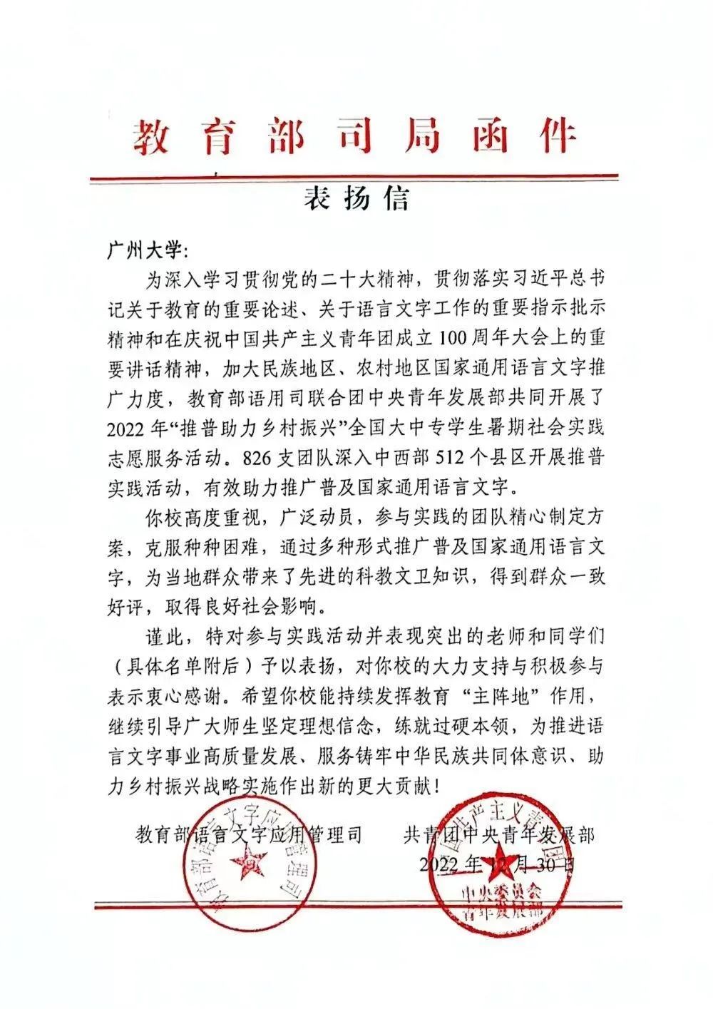 “赴毕节纳雍县推普助力乡村振兴服务队”的师生们通过不懈努力,获得丰硕成果,近日收到了来自教育部语言文字应用管理司、共青团中央青年发展部的表扬信。