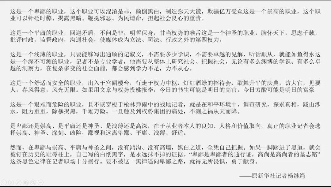 谈到新闻理想,廖勉钰学姐说拥有新闻理想是非常自豪与光荣的!如今是一个数字媒体飞速发展的时代,传统媒体的发展受到技术、自媒体等多方面的冲击,新闻人要在面对着这个时代给出的考题,但依旧还有许多新闻人奔赴在一线,为民发声,为正义守望。或许我们日后不会从事相关行业,在传播这个领域进行深造,但我们无时无刻都在进行着传播,她希望师弟师妹们用自己的温度去应对世界的问题,感受世界和理解世界。因为这就是学习新闻传播的意义。