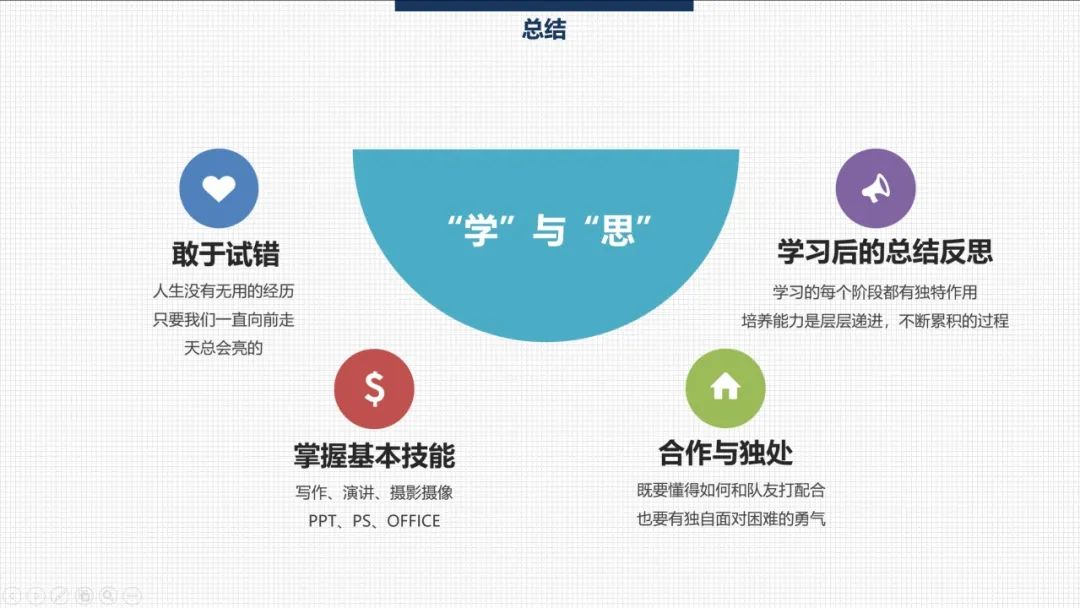 随后,学姐从以下几点出发进行了总结。首先就是敢于试错,其次就是要掌握最基本的技能,同时要学会合作与独处,无论是自我求索还是团队合作,在懂得与团队配合的同时也要有独自去面对困难面对挫折的勇气。最后要学会总结,培养能力是层层递进,不断累积的过程。