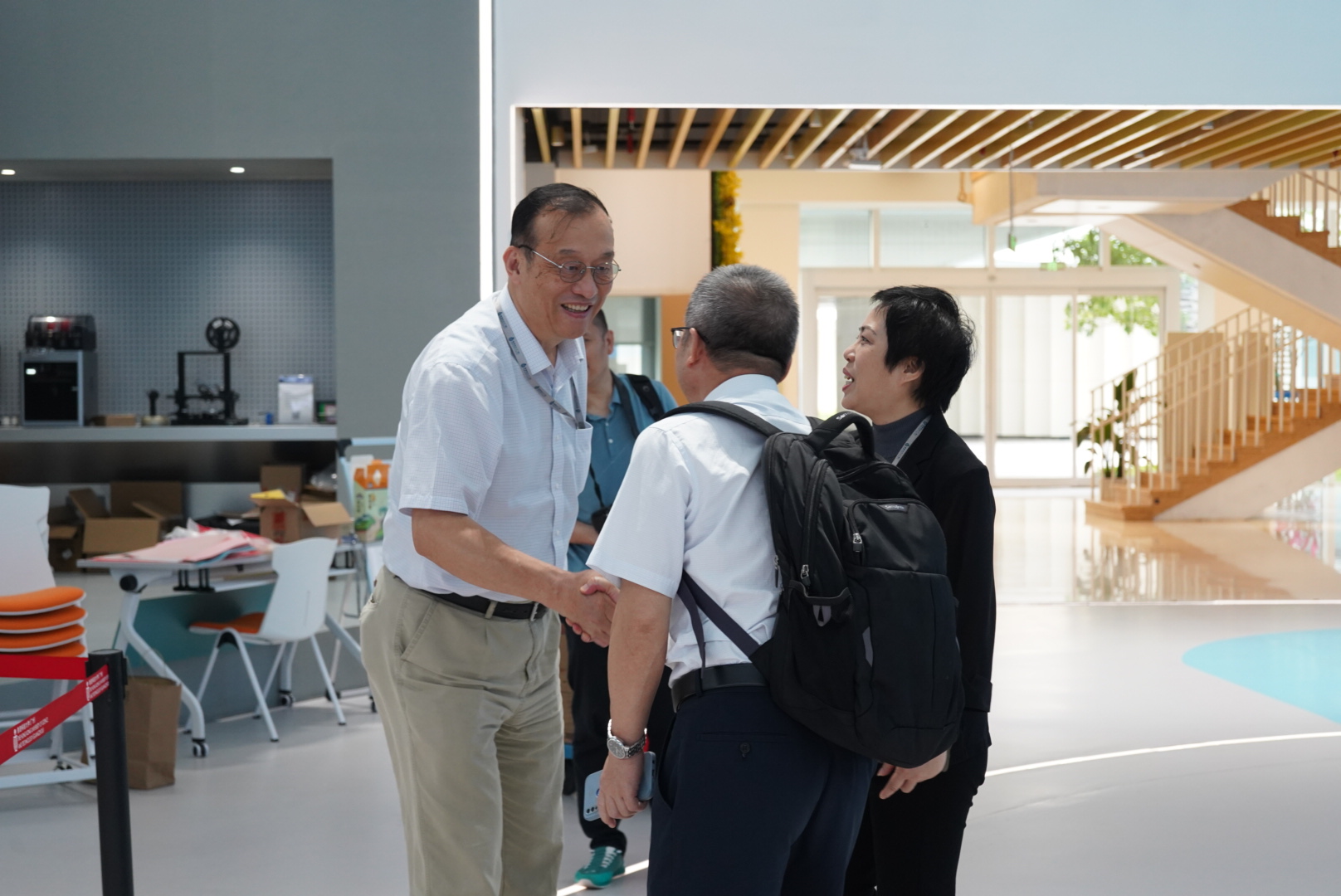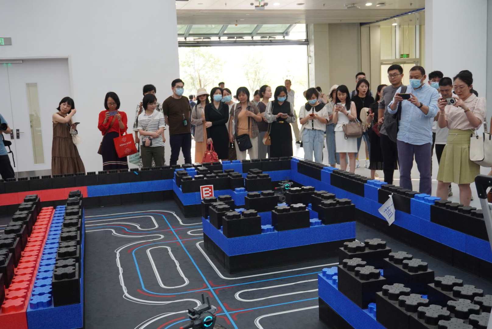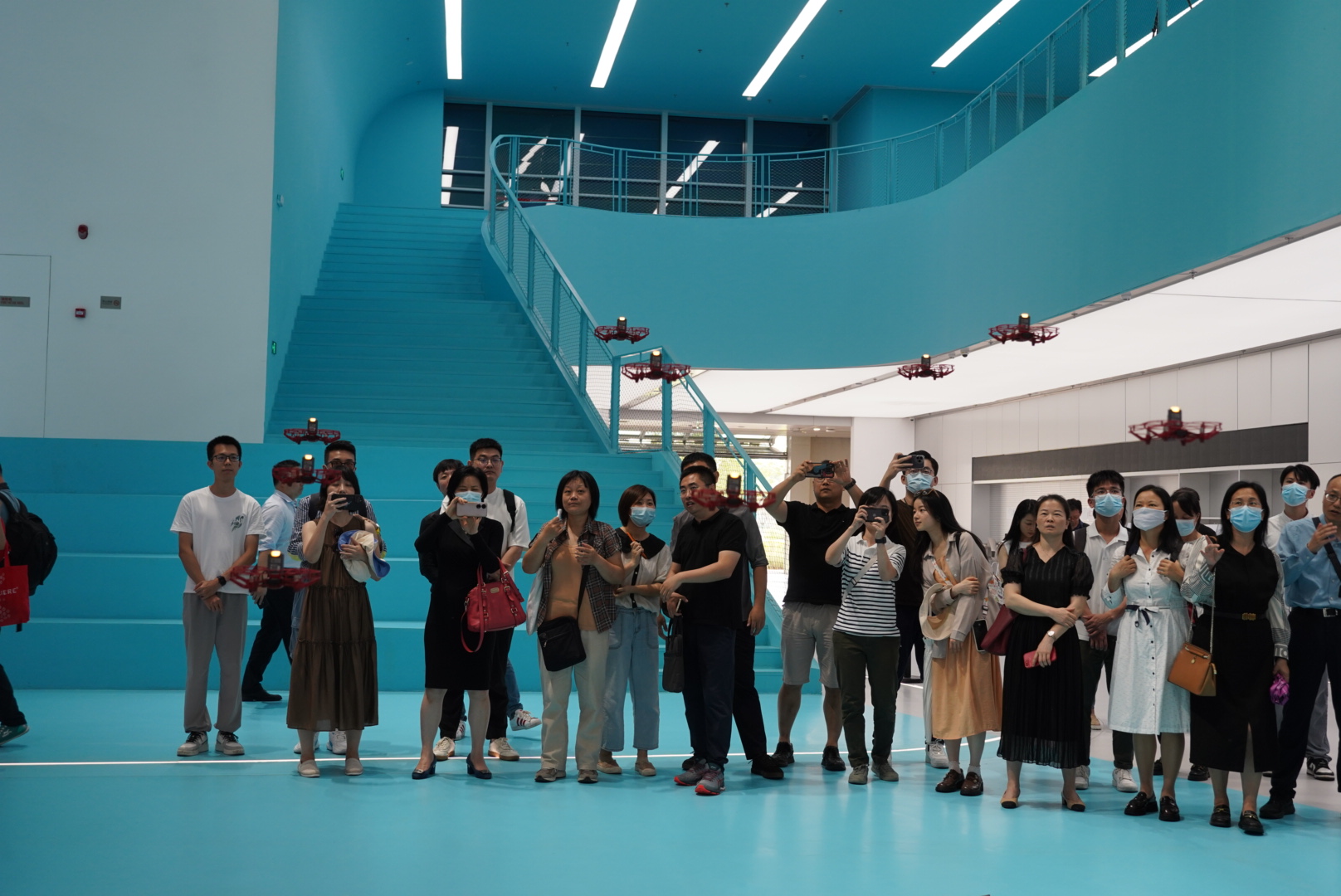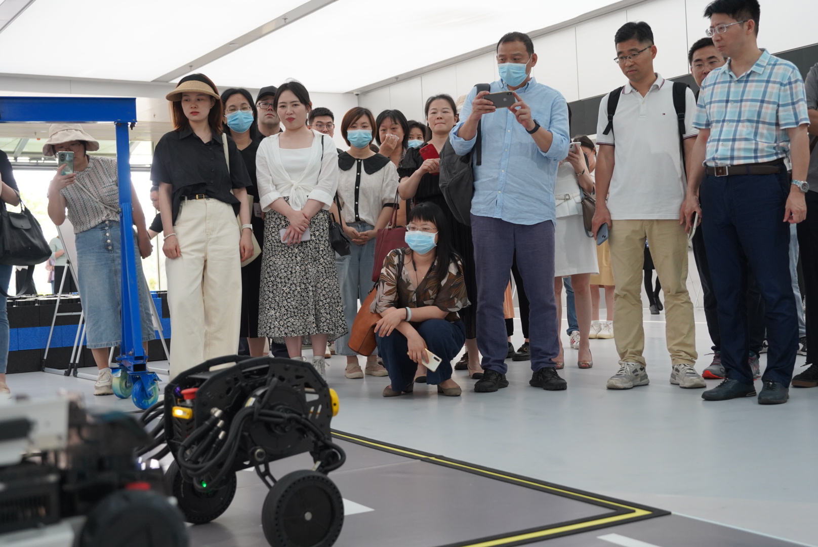 在Highbay天地,香港科技大学(广州)的同学向学院老师们介绍了目前的部分科研成果,其中包括Herculues-获香港首张无人驾驶正式牌照的无人车、无人机等。学院老师纷纷赞叹,拍照留念。
