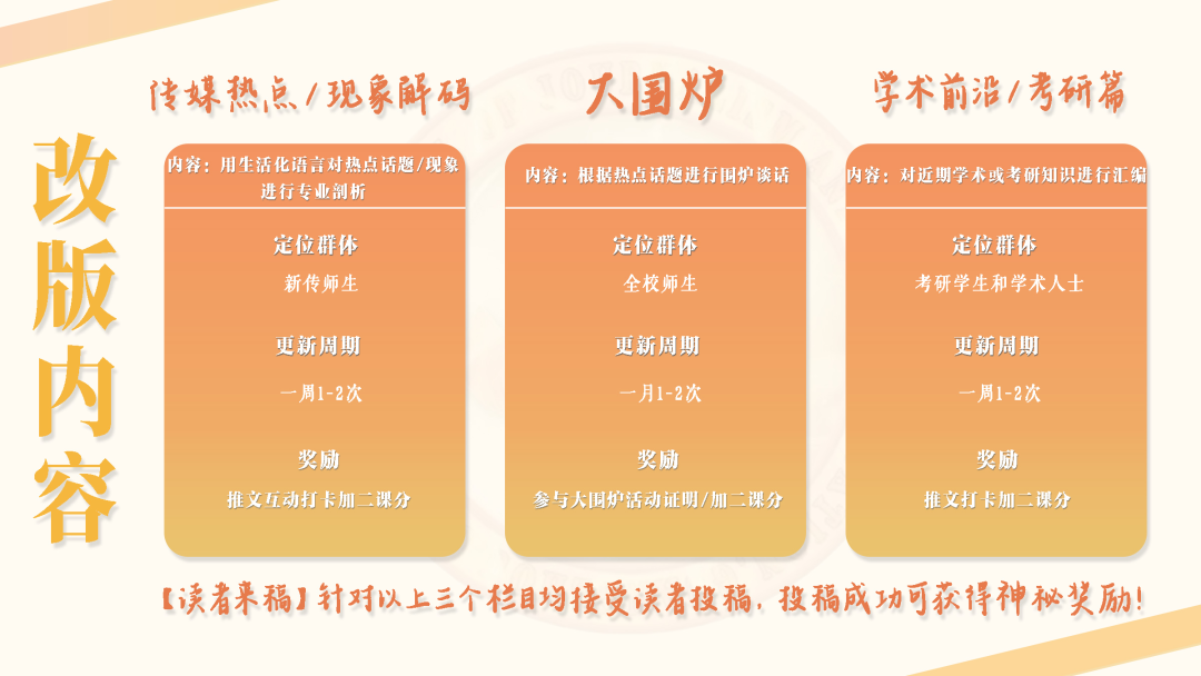 陈逸君同学表示,此次新传网会有较大的内容改版,在已有的栏目基础上,增加以传媒热点为抓手、以新闻与传播学科的学术理论为底色的多个栏目。这些栏目包括传媒热点现象解析、关于热点话题的谈话互动、学术前沿等等内容。此次改版旨在提高平台的学术氛围与互动性,更好服务新传网的主要受众群体之一——在读的本科生及研究生。