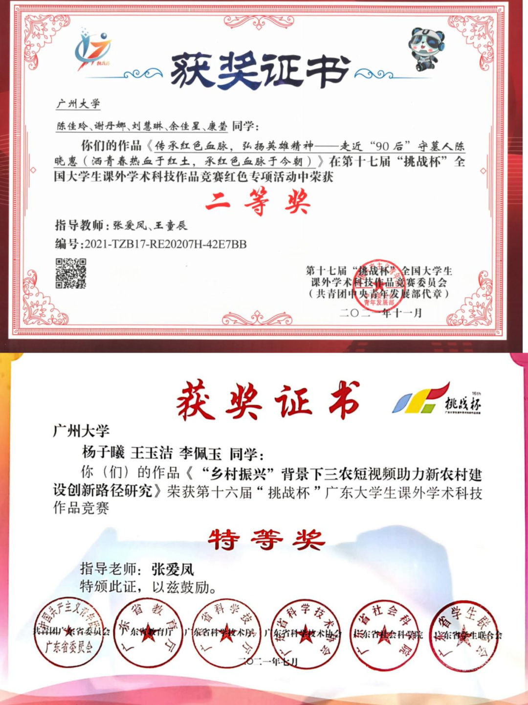 2022年,为迎接党的二十大召开,张爱凤教授继续和民政部一零一研究所联合举办“红色基因我传承 建功立业新青年”大学生解(诵)读革命烈士家书、诗词征文活动,以语言文字、经典诵读助力红色文化传播,相关成果得到政府部门采纳和主流媒体报道。张爱凤教授指导、研究生康莹负责的项目《红色基因我传承——大学生原创音视频提升红色文化传播力的创新路径研究》获得第十七届“挑战杯”广东大学生课外学术科技作品竞赛省级一等奖。
