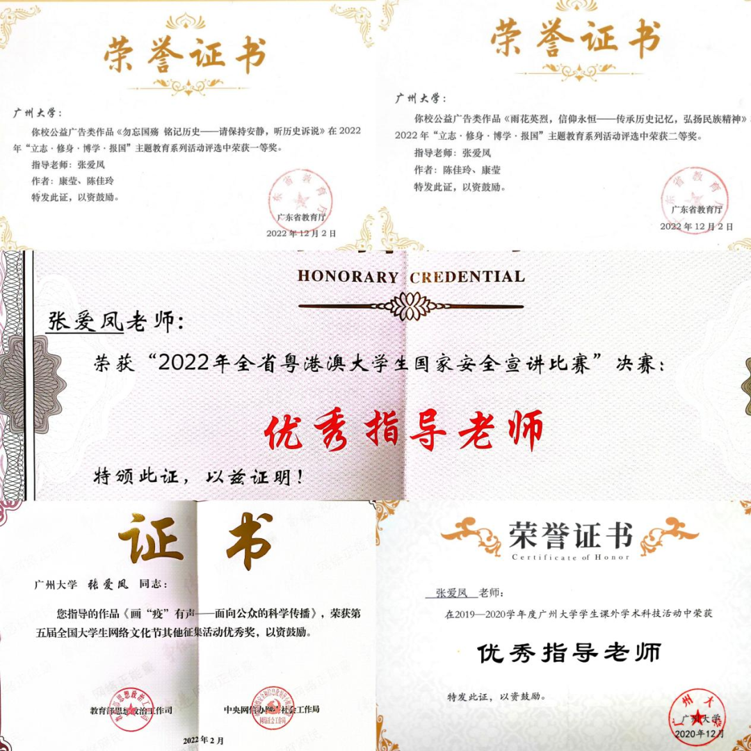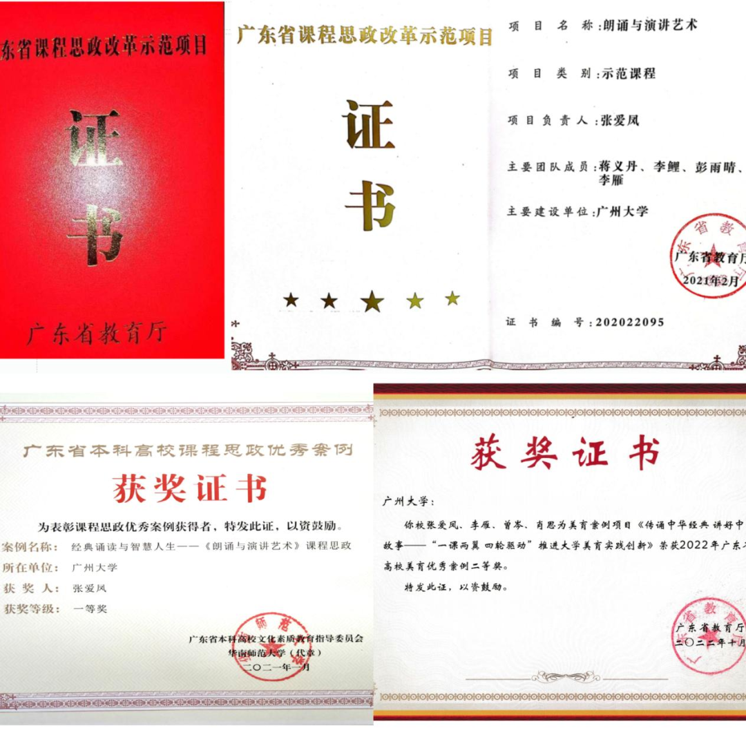 张爱凤教授的教研成果“传诵中华经典 讲好中国故事——以通识课增强大学生的文化自信”被认定为2022年广东省“粤教阅心”课程思政大家谈典型案例;“经典诵读与智慧人生”获广东省课程思政优秀案例一等奖;“传诵中华经典 讲好中国故事——‘一课两翼 四轮驱动’推进大学美育实践改革”获得广东省高校美育优秀案例二等奖等。