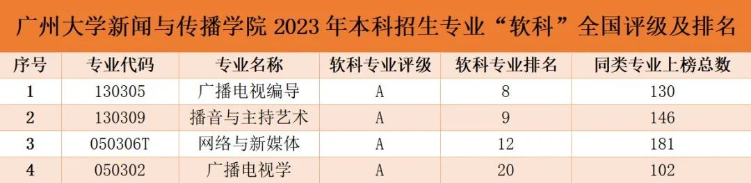 下设的4个本科专业在2023年“软科”中国大学专业评级中,均为A级。其中,广播电视编导(专业代码130305)全国软科专业排名第8;播音与主持艺术(专业代码130309)全国软科专业排名第9;网络与新媒体(专业代码050306T)全国软科专业排名第12;广播电视学(专业代码:050302)全国软科专业排名第20。