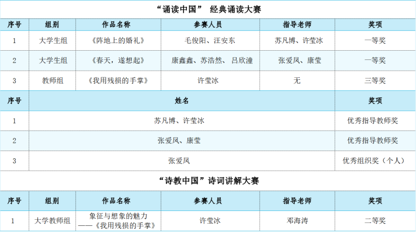 积极参与“诵读中国”经典诵读大赛以及“诗教中国”诗词讲解大赛,参赛作品全部获奖,其中一等奖2项,二、三等奖各1项,2个作品的指导教师获“优秀指导教师奖”。详细获奖名单如下: