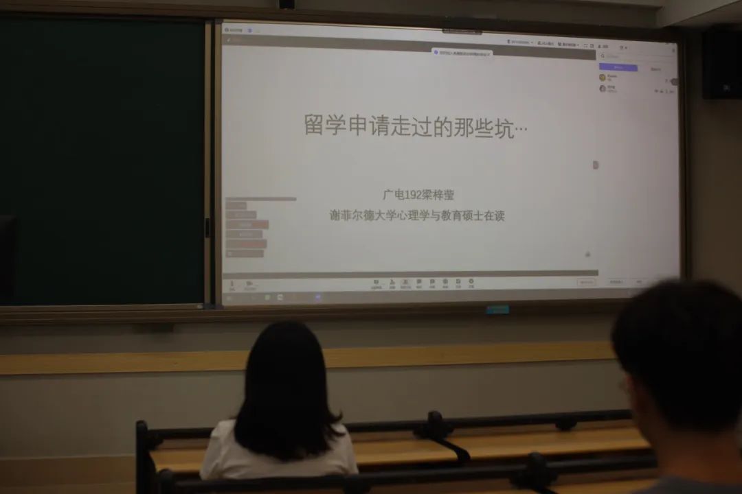 同为广电19级的梁梓莹同学则根据自己成功申请英国谢菲尔德大学的经历,分析了海外高校申请的诸多注意事项,建议大家不要完全依赖外界机构的辅助,要多考虑自身实际情况,确定适合自己的目标。同时,梁梓莹也提醒大家要注重雅思成绩,尽量把分数考到目标院校的标准线以上。