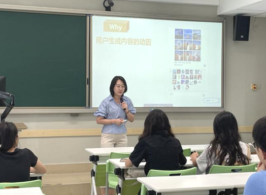 朱雅婧老师讲解的是《社交媒体》课程中的“用户生产内容”。她用生动形象的案例分析,对UGC的核心内容进行了梳理,并结合当下新媒体环境的趋势分析,让同学们真正领悟到从“受众”到“用户”的转变。