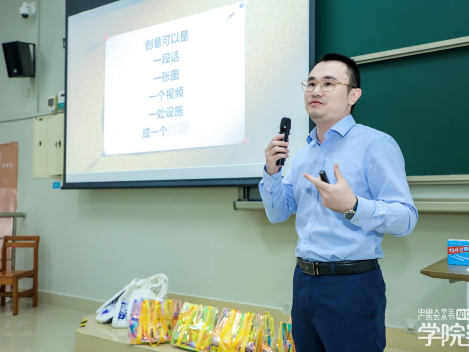 在“创意大讲堂”上,组委会特邀省广集团GIMC研究院品牌营销咨询策划部策略总监刘宇昇先生为同学们带来了名为《“创”始人》的主题分享,演讲内容新奇有趣,热点丰富。刘宇昇先生先后解析了多种案例,提出创意需要通过独特的洞察,结合差异化的表达,方能塑造其独特的吸引力。