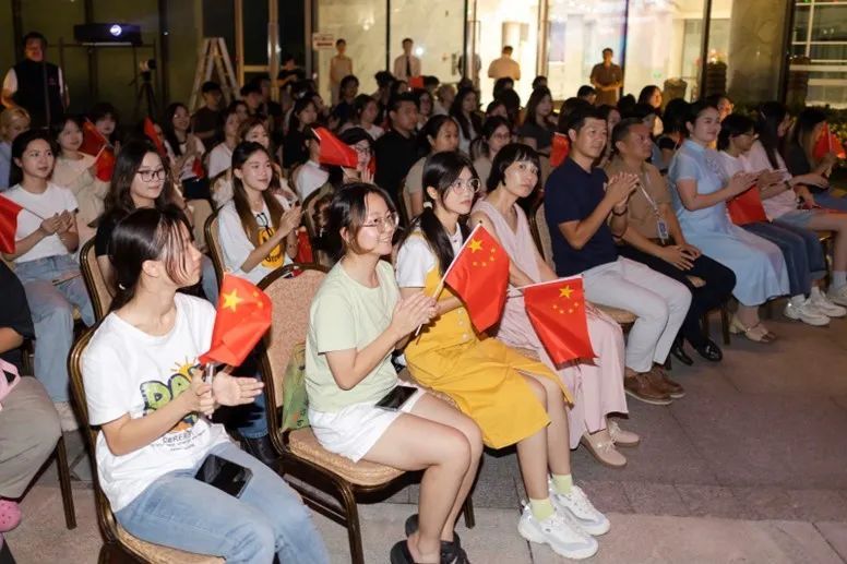 合唱团的四名学生领唱,在座的观众跟随歌声,挥舞手中的五星红旗,一同为祖国送上深深的祝福。