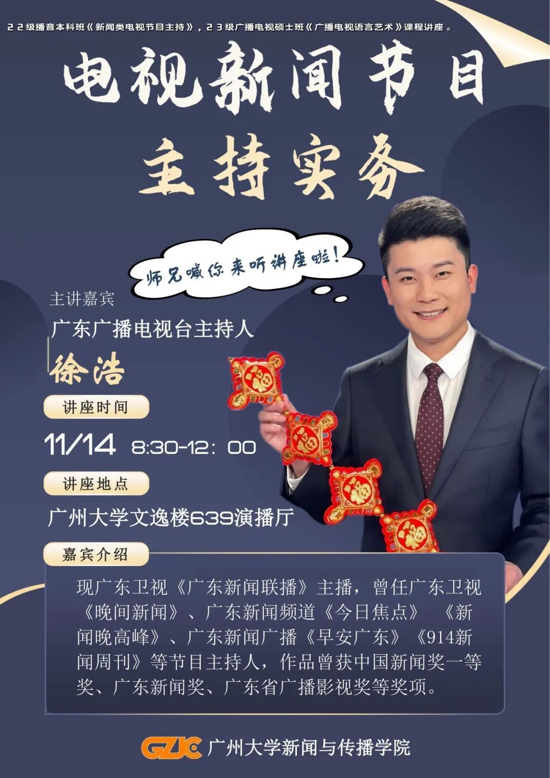 本学期《新闻类电视节目主持》《广播电视语言艺术》课程教学,先后邀请了广州广播电视台、头部MCN机构广州神狼文化、广东广播电视台等媒体的专家进课堂,推进了媒介前沿与课堂教学的对接。23级广播电视研究生艾青表示:徐浩师兄的讲座让我更加直观地感受到了新闻播音不仅要语言准确、叙事清晰,还需注重语调、节奏、情感的细微变化,增进共情传播。同时,本学期在课堂上我们也接触了MCN机构等其他媒体的专家,丰富了我对新媒介环境下播音主持业务的理解。22级播音班黄钰怡表示:讲座内容充实、收获颇多,从新闻理解到播音创作,徐浩师兄通过生动的讲解,指引我如何去做一名优秀的新闻工作者。