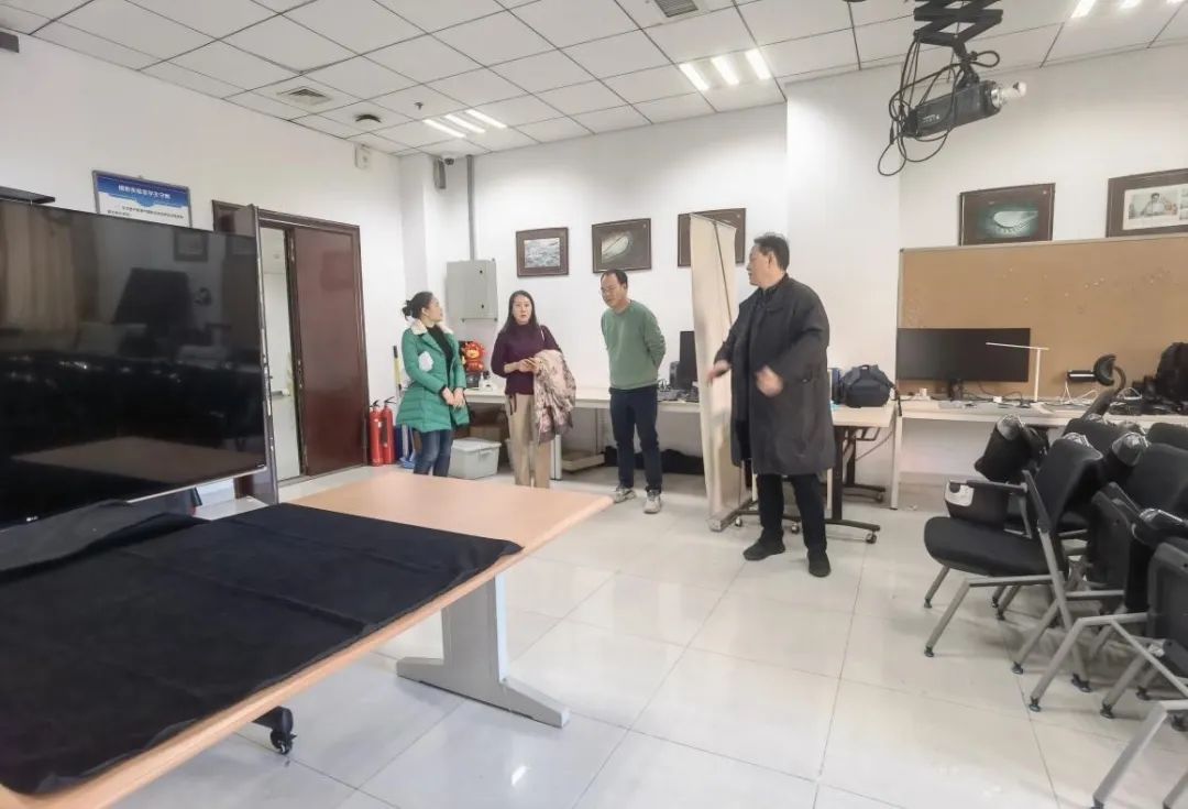 (调研团队参观中国人民大学新闻学院实验室)