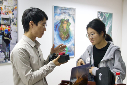 ▲在场工作人员与同学交流摄影技巧