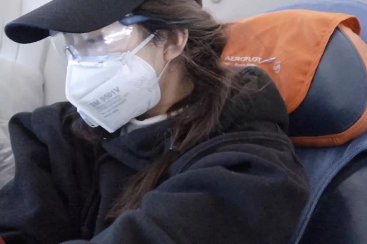 陈梓走向候机室的餐厅,那里的人不多,她选了一个角落的位置坐下,准备吃一点餐厅里的面包。但在来机场的路上,颠簸的车程让她把早餐都吐了出来。这打乱了陈梓的计划:在宿舍里吃完早餐,并做好未来30个小时里尽可能不再吃饭的准备。为了减少和细菌接触,降低摘下口罩和上厕所的风险,只能尽量减少食物的摄入。陈梓勉强往肚子里塞了些面包和一点水。“再吃到东西,不知道是多久之后了。”