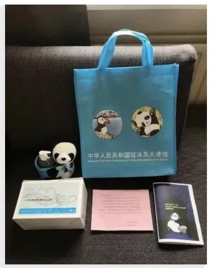 冰岛的留学生收到的“健康包”里包括口罩、酒精消毒液和抗疫指南,袋子上还印着中国国宝大熊猫和冰岛国鸟海鹦。