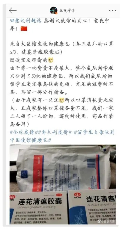 收到“健康包”后,在意大利威尼斯留学的五更希洛在微博上写道:“感谢大使馆的关心!爱我中华!”,并记录下了自己领取“健康包”的经历。