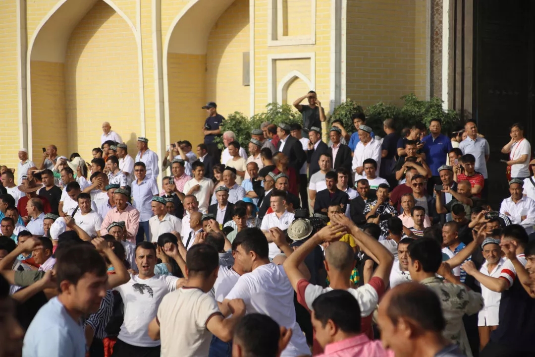 乐师登上艾提尕尔清真寺顶,奏响民族音乐。