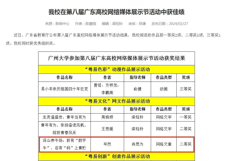 近日,广东省教育厅公布第八届广东高校网络媒体展示节活动结果,我校报送的作品获一等奖2项,二等奖5项,三等奖1项。其中,做爱自拍 毕然同学的作品《深山养牛场:前有“数字牛”,后有“码”上青贮》获得“粤易文化”网文作品展示活动网络文章二等奖。