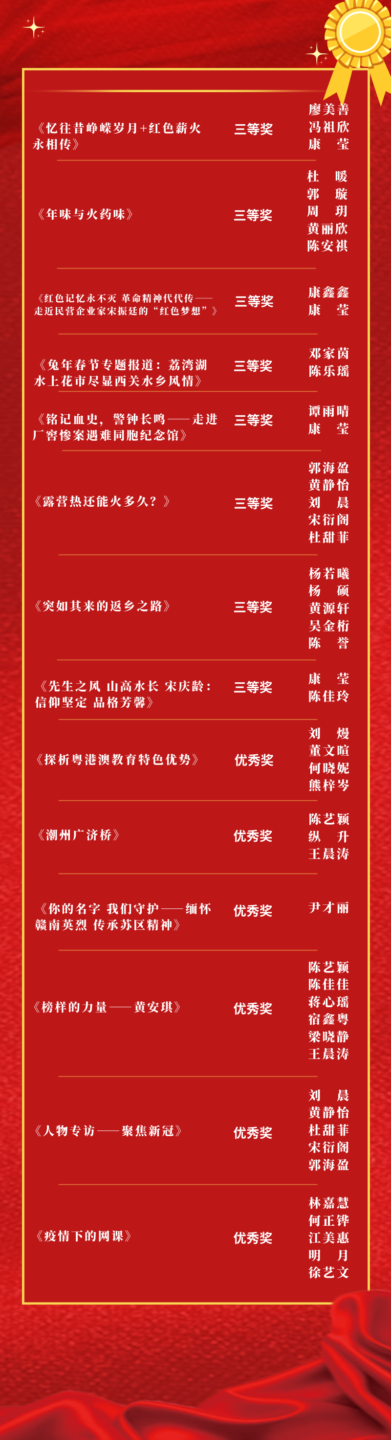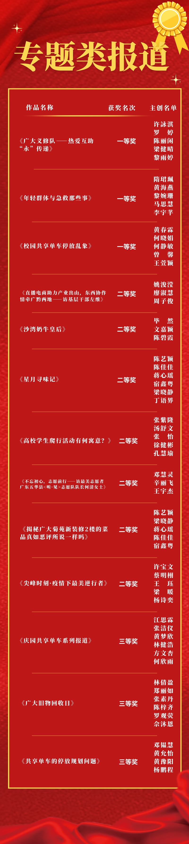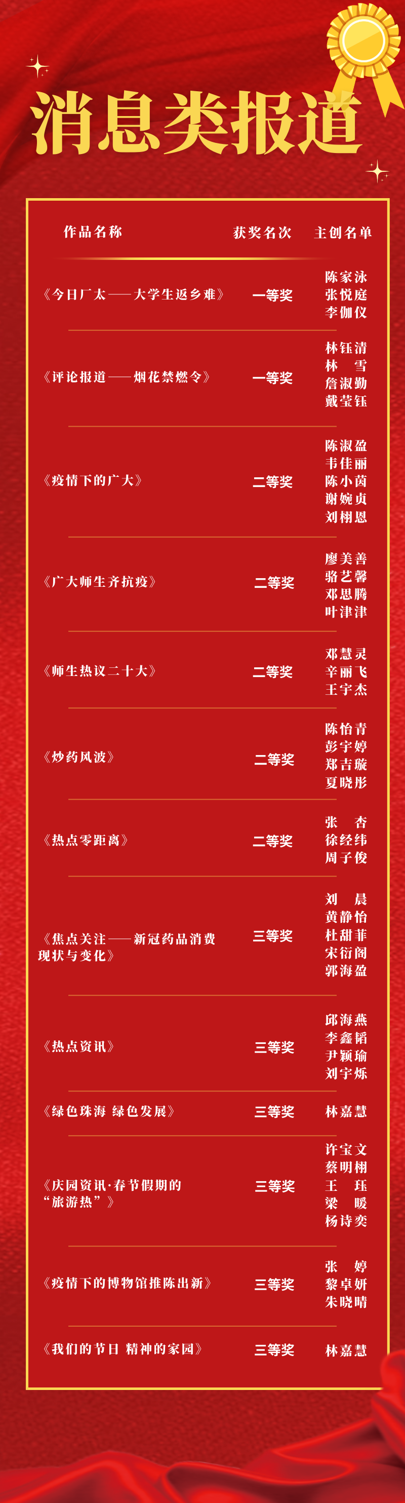 本次大赛分为消息类作品和专题类作品两个组别,消息类作品收到投稿20余部,专题类作品收到投稿30余部。评委围绕《电视新闻学》的教学要求,从选题价值、新闻策划、记者采访能力、画面和声音的运用能力以及视频拍摄水平及后期制作质量等几个评判维度对作品进行了综合打分,获奖名单如下: