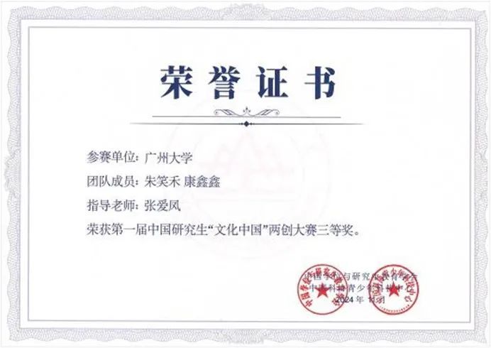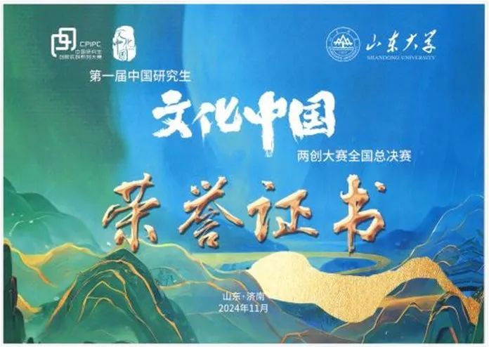 ▲第一届中国研究生“文化中国”两创大赛获奖证书