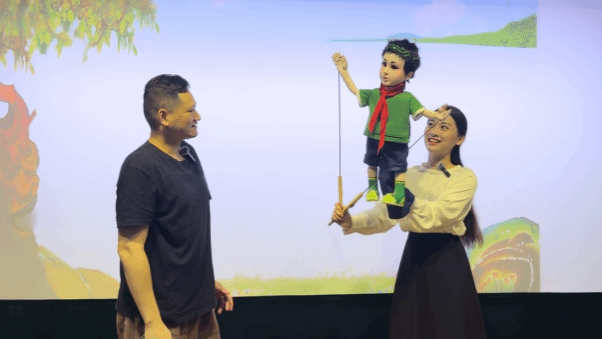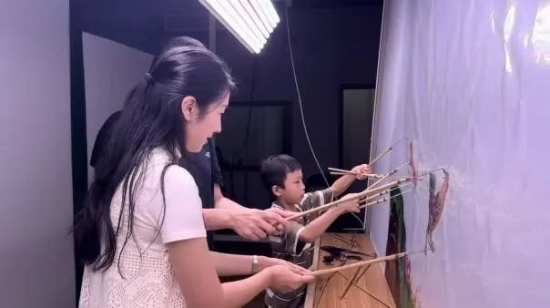 ▲康鑫鑫(图1左)、朱笑禾(图2右)体验陆丰皮影、木偶戏操作