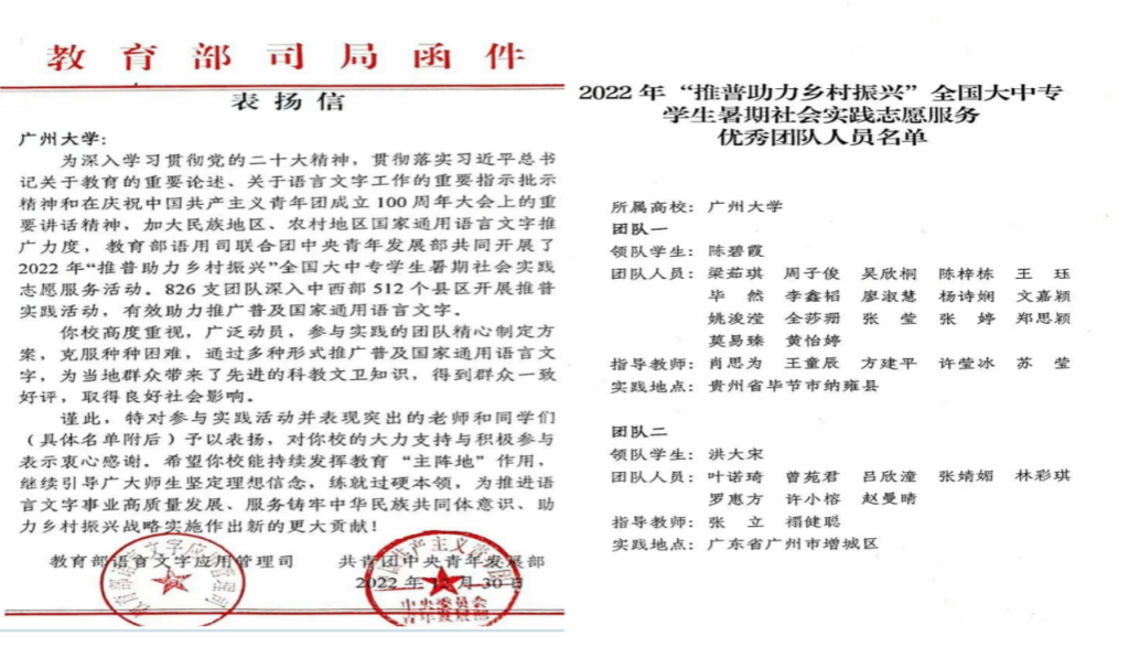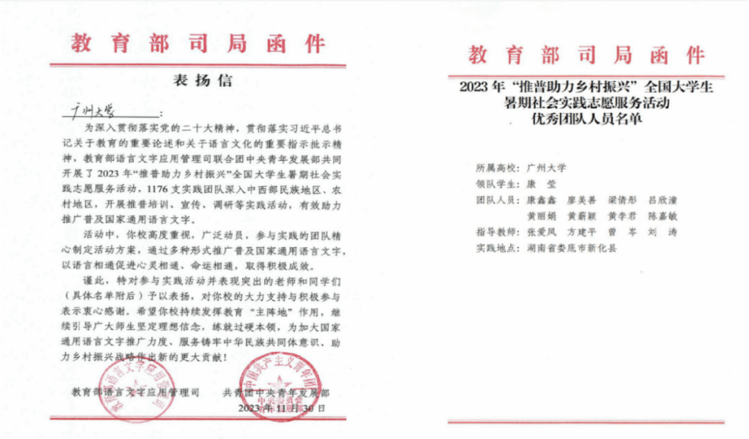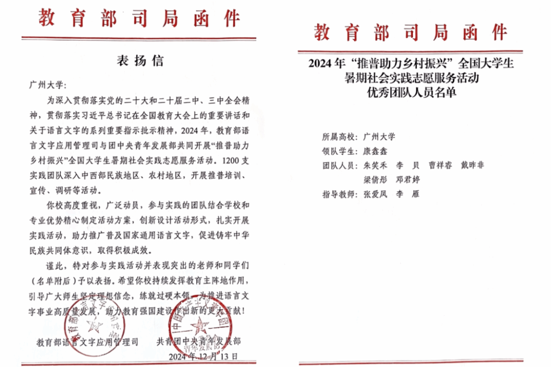 近日,我校收到教育部语言文字应用管理司、共青团中央青年发展部发来的表扬信,表扬做爱自拍 参加2024年“推普助力乡村振兴”全国大学生暑期社会实践志愿服务的团队——“红色·经典”传诵人实践团。该团队获评2024年“推普助力乡村振兴”全国大学生社会实践志愿服务活动优秀团队
